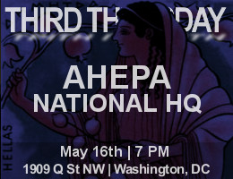 Third Thursday | AHEPA National HQ Rooftop | May 16, 2013Join us on Thursday, May 16, 2013 at 7 PM at the rooftop of AHEPA National Headquarters in Dupont Circle for this month's Third Thursday, where the Hellenic Community of Washington, DC will be hosting a happy hour benefiting the Demeter Initiative. While we as the hosts of Third Thursday are not involved in the actual planning of this event, just as we don't run the bars and restaurants that serve as the locations for our other happy hours, the goal of Third Thursday has always been to get Greeks and Philhellenes together, so rather than split up the community by hosting a happy hour at another location, we're encouraging everyone to join in this wonderful cause. The organizers of this event have gotten food and drinks donated by a myriad of Greek and Greek-owned establishments from all over the DC area, so rather than charging for drinks, they're encouraging attendees to provide a free-will donation to support the Demeter Initiative. For those of you who have never been to an event at the AHEPA National Headquarters rooftop, check out these photos from the MezeMania Saturday Afternoon Happy Hours at DCGreeks.com Pan-Hellenism Weekends in 2010, 2011, and 2012. Location AHEPA National Headquarters Getting There Driving Directions See you there, Aristotelis Chronis | Themistocles Chronis | Sofia Plagakis | Christiana Shoushtari | Michael Veronis If you have a suggestion on where the next Third Thursday should be, email us at [email protected], join our Facebook group. We would love to hear from you! Since 2001, Third Thursday has provided Greek-Americans, Greeks, Cypriots, and Philhellenes from the Washington, DC area and beyond the chance to meet every month in a relaxed atmosphere, particularly welcoming those who have moved from different parts of the country for work or school into the greater DC area Greek community. With visits to a variety of bars, restaurants, and lounges in the most vibrant neighborhoods of DC, Maryland, and Virginia, Third Thursday is a great way to catch up with old friends and make new ones in the Greek community. As it now embarks on its third iteration since its founding, we promise to maintain the simple principles of its founders, while expanding the event to an ever-changing audience of Greeks in the area. We look forward to seeing you -- or meeting you for the first time -- at the next Third Thursday.