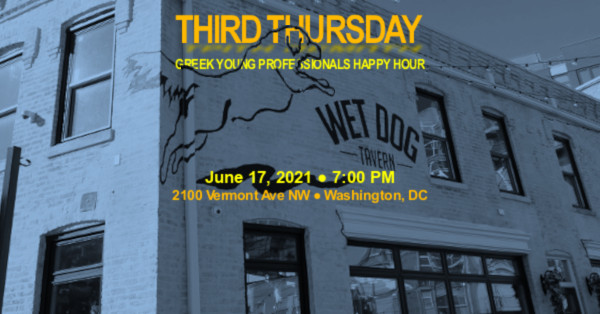 Third Thursday Greek Young Professionals Happy Hour Join us on Thursday, June 17, 2021 at 7:00 PM as the Third Thursday Greek Young Professionals Happy Hour series celebrates its return to the District for the first time since January 2020 as we head to Wet Dog Tavern. Located slightly north of the U St. Corridor, Greek-owned Wet Dog Tavern is DC's first Bar Garden, featuring a wide selection of beer, wine, and spirits, with an expansive outdoor space adding to its super-relaxed atmosphere. We'll have extended happy hour specials available for the group! Last month's Third Thursday saw a crowd of 19 people show up, a fantastic turnout for our first in-person happy hour since the pandemic began. We're hope to keep that momentum going as things begin to open back up! Wet Dog Tavern Getting There Driving Directions See you there, Aristotelis Chronis | Themistocles Chronis Since 2001, Third Thursday has provided Greek-Americans, Greeks, Cypriots, and Philhellenes from the Washington, DC area and beyond the chance to meet every month in a relaxed atmosphere, particularly welcoming those who have moved from different parts of the country for work or school into the greater DC area Greek community. With visits to a variety of bars, restaurants, and lounges in the most vibrant neighborhoods of DC, Maryland, and Virginia, Third Thursday is a great way to catch up with old friends and make new ones in the Greek community. We strive to maintain the simple principles of its founders while expanding the event to an ever-changing audience of Greeks in the area. We look forward to seeing you -- or meeting you for the first time -- at the next Third Thursday.
