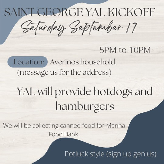 Join the St. George YAL at their 2022 Kick-Off at the Averinos Household in Gaithersburg, MD on Saturday, September 17, 2022 from 5:00 PM - 10:00 PM! This is a potluck style gathering, with the YAL will be providing hotdogs and hamburgers. Please bring canned food for the Manna Food Bank.