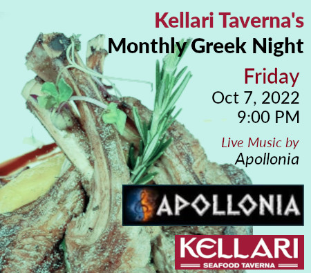 Join us on Friday, October 7, 2022 for a memorable night with authentic Greek food, wine, and dancing at the October 2022 edition of Kellari's Monthly Greek Night with live Greek music by Apollonia!
