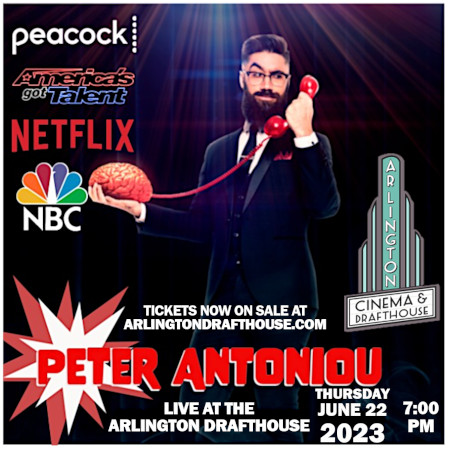 Arlington Cinema & Drafthouse Invites You to Experience Psychic Comedian PETER ANTONIOU at Arlington Cinema & Drafthouse One Night Only Thursday, June 22, 2023 Tickets: $25