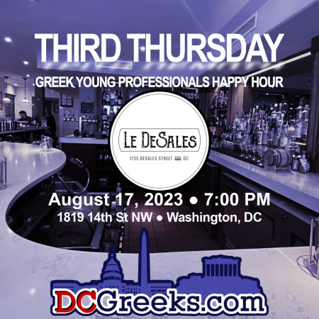 Join us on Thursday, August 17, 2023 starting at 7:00 PM as the Third Thursday Greek Young Professionals Happy Hour series visits Le DeSales in Washington, DC. Located in South DuPont and the Golden Triangle neighborhood of DC, right across the street from the historic Mayflower hotel, Le DeSales has happy hour specials that run until 8 PM featuring $9 speciality cocktails, $8 wine, $6 draft beer, and a selection of appetizers!