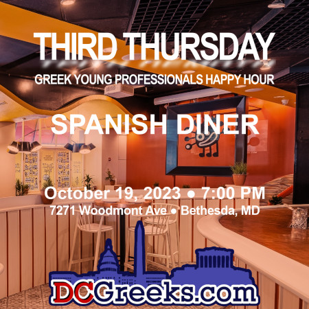 Join us on Thursday, October 19, 2023 at 7:00 PM as the Third Thursday Greek Young Professionals Happy Hour series celebrates its 22nd anniversary of monthly happy hours with a visit to Spanish Diner in Bethesda, MD. From world famous chef, José Andres, Spanish Diner features tapas-focused Spanish fare in an airy, colorful bistro setting with upscale happy-hour crowd. Their all night Sangria Hour Menu features $5-$6 beers, selected sangria, wines, and cocktails from $6-$9, and selected Comidas from $6-$11! Third Thursday only makes it up to Maryland once or twice a year, so don't miss out on the chance to join us outside the District!