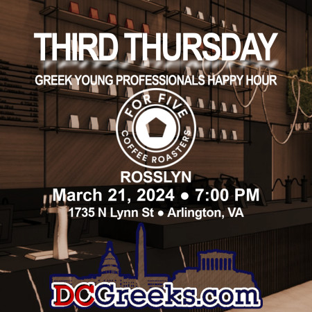 Join us on Thursday, March 21, 2024 at 7:00 PM as the Third Thursday Greek Young Professionals Happy Hour series visits the newest location of For Five Coffee Roasters in the Rosslyn neighborhood of Arlington, VA. From the boys who brought you Balos, For Five emerged as a vision brought to life by two lifelong friends, Stefanos Vouvoudakis and Tom Tsiplakos, both hailing from Queens. Their enduring friendship, forged in a Whitestone classroom back in third grade, laid the foundation for a remarkable journey, which now continues with the opening of their sixth DC area location. For those of you asking why we're doing a happy hour at a coffee place, rest assured that For Five does have a liquor license and is looking forward to hosting us.