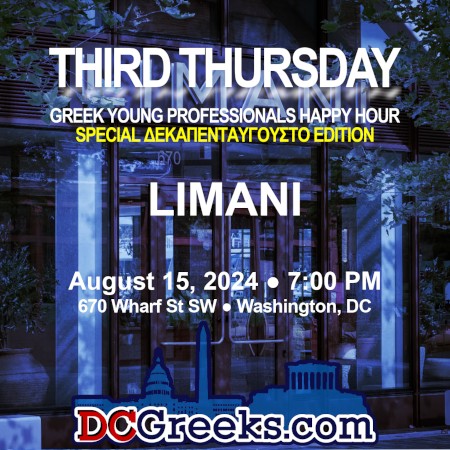 Join us on Thursday, August 15, 2024 at 7:00 PM as the Third Thursday Greek Young Professionals Happy Hour series visits Limani in Washington, DC for a special Δεκαπενταύγουστο Edition!. Located at The Wharf, Limani offers a stunning waterfront dining experience with a focus on Mediterranean-inspired dishes. We're presently scheduled to have reserved space on the third floor penthouse terrace level (subject to change, based on availability) and we've secured extended happy hour food and drink specials all night specifically for this event! While we normally don't ask for RSVPs, given the special nature of this event, we'd appeciate those planning on joining us to message us on Instagram/Facebook or email us at [email protected].