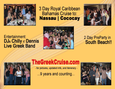This year’s version of “The Greatest Greek Party on Water!!”, leaves Miami on Friday, January 13th for three nights with stops in Cococay and Nassau in the Bahamas returning on Monday, January 16th. For those of you who have a couple of more vacation days to use, there are two days of pre-partying in South Beach on Wednesday and Thursday. The trip features two private Greek parties on the boat featuring DJs CnD and a formal dinner. (The first of these parties will be open bar.) Those who have been on this cruise over the past eight years say that it’s a change of pace to the typical conference as the smaller numbers of participants give people a chance to meet and know each other over the course of the three day weekend. Prices for this cruise start at a mere $259 per person, but end on 9/28/05. Those wishing to attend this cruise can find reservation forms and a full itinerary here.