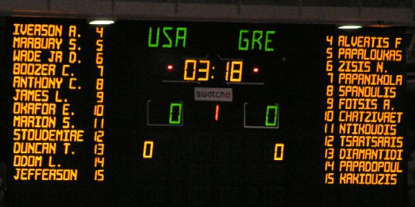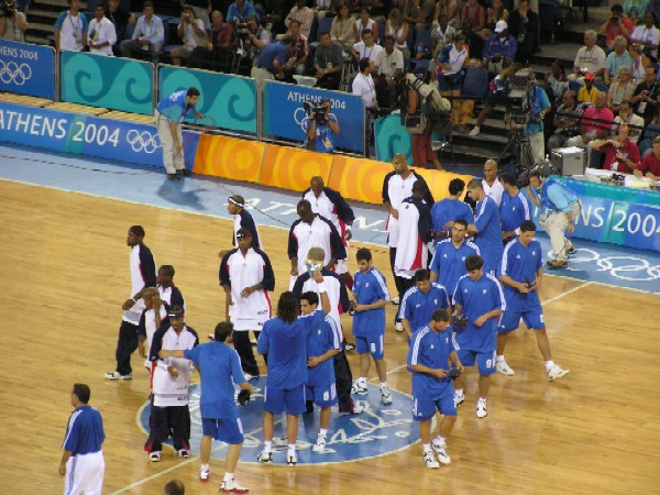 deafening -- those 12,000 fans were as loud as 80,000-100,000 fans cheering in domed and open-air stadiums I've been to in my college days following UVA sports.) Fans from Spain and Argentina, teams which played a thrilling game to start the night's two-game session, joined in on the pro-Greek chants; while the Greek language is not universal, clapping in rhythm and whistling (i.e. the non-American form of booing) every time Iverson touches the ball is. For the first time ever in my lifetime of watching US basketball, given the environment in which they were playing, Team USA seemed like underdogs. Couple this with the reality that a loss to the Greek team would have been a