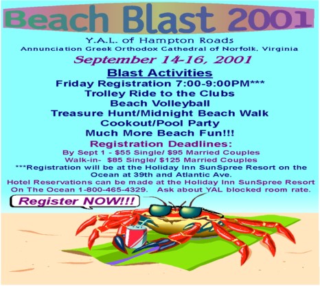Great vacation, lower season rates, lot's of fun. Make Your Reservations NOW!!! Before YAL Special Rates Deadline Register Today!!! And pay early bird registration. Annunciation Greek Orthodox Cathedral of Norfolk invites you to our Y.A.L. Summer Beach Blast 2001 September 14-16 Virginia Beach, Virginia Friday 7:00PM-9:00 PM- Registration at Holiday Inn SunSpree Resort, 39th St. & Atlantic Ave. 9:30PM-10:00PM- Meet at the Pool. 10:30PM-1:30PM- Trolley Ride to Clubs (21 or older) Saturday 9:30 AM- Volleyball Games & **Beach Activities 12:00PM- Lunch Served at North End Pizza 1:00PM- Continued Beach Fun **Tug-o-war, football, paddleball, frisbee, etc. 3:00PM- Free time/Scavenger Hunt(prizes will be awarded at the Dinner) 7:00PM- Dinner/Evening Entertainment at Colonial Inn at 28th St. and Atlantic Avenue After Dinner-Boardwalk Night Games, Midnight Boardwalk. Sunday 10:00AM- Divine Liturgy at Annunciation Greek Orthodox Cathedral of Norfolk 12:30PM Until- Cookout/Pool Party Rooms have been blocked at the Holiday Inn SunSpree Resort Hotel at a very reasonable price. call 1-800-465-4329 or visit our webpage for more details http://www.norfolkyal.pair.com/Events_BeachBlast.html Janet Jenkins- [email protected] or Our YAL email at [email protected] Make checks payable to: YAL of Hampton Roads Mail Registration to: YAL Beach Blast 2000 Attn: Janet Jenkins 1600 Springmeadow Blvd. Norfolk, VA 23518