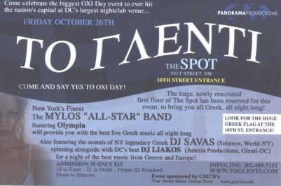 THE SPOT Featuring The MYLOS "ALL-STAR" BAND along with Olympia, providing you with the best live Greek music all night long. Also featuring the sounds of NY legendary Greek DJ SAVAS (Seismos, World-NY), spinning alongside DC's best DJ LIAKOS (Asteria Productions, Glenti-DC) for a night of the best Greek Anthems! The huge, newly renovated first floor of The Spot has been reserved for this event, to bring you all Greek, all night long! THERE WILL BE A SEPARATE ENTRANCE FOR THE "GLENTI" GREEK NIGHT. Just look for the huge Greek flag at the Spot's 10th and F Street "Greek" entrance. ADMISSION IS ONLY $15 18 to enter, 21 to drink, proper ID required. Dress to impress. The Spot is located at 932 F Street, NW Washington DC. For more info visit http://www.toglenti.com or www.gmcds.com (under events) or call 703-371-9898 for details. Join Greeks from New York, Philadelphia, Richmond, and Baltimore in The Nations Capital for DC's MEGA-GREEK "OXI" INDEPENENCE DAY GLENTI! REMEMBER IF ITS NOT AN ASTERIA & PANORAMA PRODUCTIONS "GLENTI" THEN ITS NOT A REAL GLENTI! Event sponsored by Greek Music CD's (GMCD's) you ultimate source for Greek music.