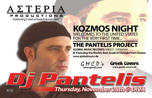 FIVE YEAR ANNIVERSARY PARTY @ D I V A!!! Asteria Productions would like to take the time to thank all of our loyal patrons and associates who have supported us through these past 5 years. Our sincere thanks & appreciation goes out to all, especially to those individuals and companies that took an initial chance on us and thus have partially helped form what we are today. THANK YOU FOR 5 GREAT YEARS!!! Asteria Productions Proudly Presents: KOZMOS NIGHT The 5 Year Anniversary & Thanksgiving Edition @ DIVA Doors Open @ 10:00pm Featuring for the first time in the United States, the world's best Greek DJ: DJ PANTELIS (Global Music Records-Greece & Germany) & Opening up the Night, DC's Young: DJ Mixalis Since 1983, DJ Pantelis has been captivating audiences in Greece and the rest of Europe. His unique "remixes" have elevated him to the top of the Greek DJ/Production scene. His DJ tour includes stops at some of Greece and Europe's hottest clubs including Privilege, Nitro, Rex and starting in December Alacitas. He has numerous upcoming projects with Heaven Records & Global Music Records, including official remixes for Despina Bandi and Yiorgos Mazonakis. Also scheduled for release in 2003, DJ Panteli's official album "To Stolidi" containing 10 original, never before heard mixes prepared exclusively by DJ Pantelis. Admission: Complimentary- Sfinakia & Promo CD's (Compliments of GMCD's - Asteria Productions & Global Music Records) Kozmos Night is 18 to Club & 21 to Drink. Proper ID & Attire a Must! COMING SOON...NEW YEARS 2003!!! (More Info. to Follow)
