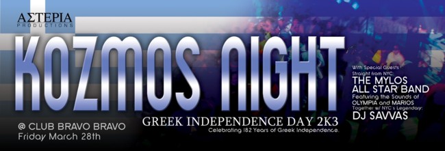 Asteria Productions Invites you to Kozmos Night Celebrating Greek Independence 2K3 & Featuring From NYC DJ Savvas & The Mylos All-Star Band
