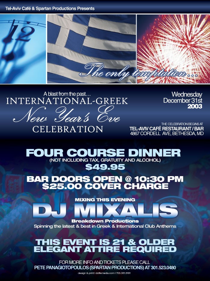 Tell your friends (Greek, American, whatever) that instead of attending a loud, stuffy and smoky Greek night at some hole in the ground in DC or watching that fancy ball drop in Times Square, ring in 2004 with a wonderful dinner, sponsored by Velouchi ITIA Chapter, and show off your "old school" (yes, we'll play "ITIA" for you) and modern dance skills. Plus, while in Bethesda, you don't have to worry about walking great distances in the frigid December air, parking on DC's streets and driving in DC with other New Year's revelers.