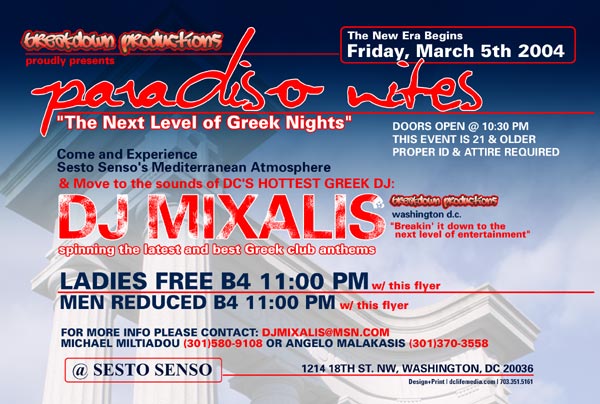 THE NEW ERA BEGINS FRIDAY, MARCH 5TH 2004 COME AND EXPERIENCE SESTO SENSO'S MEDITERRANEAN ATMOSPHERE AND MOVE TO THE SOUNDS OF DC'S HOTTEST GREEK DJ: DJ MIXALIS(BREAKDOWN PRODUCTIONS-DC) SPINNING THE LATEST AND BEST GREEK CLUB ANTHEMS