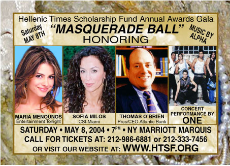 HELLENIC TIMES SCHOLARSHIP FUND TO HOST MASQUERADE BALL HONORING ENTERTAINMENT TONIGHT'S MARIA MENOUNOS, CSI: MIAMI & SOPRANOS STAR SOFIA MILOS, ATLANTIC BANK CHAIRMAN THOMAS O'BRIEN, AND FEATURING A CONCERT APPEARANCE BY POP GROUP "ONE." NEW YORK: The Hellenic Times Scholarship Fund will honor Entertainment Tonight's Maria Menounos, Sofia Milos, star of the hit television shows "CSI: Miami," and "The Sopranos," and Thomas O'Brien, Chairman & CEO of Atlantic Bank at the Annual HTSF Gala at the New York Marriott Marquis Hotel on Saturday, May 8, 2004. The HTSF is also pleased to welcome pop group "ONE" who will be traveling from Greece to perform at the Gala. The theme of this year's Gala is "The Masquerade Ball." Guests are welcome to bring their own masks, but masks will be provided at the Gala as well. Over 1200 guests are expected to attend and returning as scholarship presenters this year will be many past honorees as $100,000 in scholarships will be awarded to students from across the United States. The event will also feature a Festival of Gems display where guests may purchase jewelry in every shape and color. Honoree - Maria Menounos The HTSF is proud to present its Journalistic Achievement Humanitarian Award to Entertainment Tonight correspondent Maria Menounos. Since joining ET in the 2001-02 season, Menounos' duties have included reporting on film, television, music and fashion for the #1 syndicated entertainment newsmagazine in the world. Most recently, Menounos served as host of the Academy Awards' arrivals show "Oscar Countdown 2004." She also serves as host of ET on MTV, one of the highest rated shows on the cable network, as well as ET on VH1, and she has appeared on the CBS drama "Without A Trace." Previously, Ms. Menounos was an international correspondent for Channel One News, the #1 source of news for America's teen students. As a journalist for their 10-minute weekday broadcasts, she reported on a variety of timely and topical issues to more than eight million students. During her tenure, she interviewed President George W. Bush, numerous celebrities, and traveled the world to cover such tragedies as the 2001 earthquake in El Salvador and the AIDS epidemic in South Africa. Ms. Menounos began her career with Channel One during her senior year at Emerson College in Boston. During this time she also wrote, produced and broadcast news segments for WERS-FM, one of the largest college radio stations in the country. In addition, she co-hosted and produced a weekly radio talk show on Boston's WNRB-AM. Her experiences as a journalist have compelled Ms. Menounos to spend time off-camera on philanthropic and social issues close to her heart. After witnessing the devastating effects of AIDS in South Africa as a Channel One reporter, she formed Take Action Hollywood!, a charity whose mission is to utilize the power of the entertainment industry and the production medium to educate, empower and raise social awareness. Honoree - Sofia Milos The HTSF is proud to present its Artistic Achievement Humanitarian Award to Sofia Milos who currently stars opposite David Caruso on the hit CBS drama CSI: Miami as detective Yelina Salas. Born in Zurich, Switzerland, Milos began a modeling career at the age of 15, which helped pay her way through Business and Economics school in Switzerland. In the years to come her fashion career took her around the world and in 1990 she followed her acting dream to Los Angeles where she landed her first film role, Inside Out, co-starring Lesley Anne Down and Kris Kristofferson. In 1993 she landed a part in the Valerie Bertinelli sitcom Café Americain, which paved the way to a series of television appearances on Friends, Mad About You, Thieves with John Stamos and Curb Your Enthusiasm. In 1997, Sofia was cast in one of her most memorable roles as Julia Karinsky in the NBC series Caroline in the City. As the sexy, passionate and wealthy Italian wife of Richard, she was uproariously funny. In 1998, she appeared as the young Olympia Dukakis in Jane Austen's Mafia! But the role that garnered her the most attention was that of mob boss, Annalisa Zucca, on the HBO series The Sopranos, in which she went up against Tony Soprano. Milos has also lit up the silver screen with many films including The Order with Jean Claude Van Damme, and Passionada, a romantic comedy, which garnered her rave reviews. Honoree - Thomas O'Brien The HTSF is also proud to present its Corporate Leadership Humanitarian Award to Mr. Thomas O'Brien, Chairman and CEO of Atlantic Bank. O'Brien joined Atlantic Bank in May of 2000 from North Fork Bank where he served as Vice Chairman since 1996. Prior to that, he was Chairman, President and CEO of North Side Savings Bank, a position he held for 13 years. Established in 1926, Atlantic Bank of New York is among the top 20 commercial banks in the New York area. With $3.0 billion in assets, Atlantic Bank is a full-service commercial bank with branch offices throughout the metropolitan New York City region, and Boston. Atlantic Bank is also a member of the global-financial network of the National Bank of Greece, which has more than $50 billion in assets and operates in 16 countries. O'Brien serves as a Director or Trustee in many organizations including, the $100 billion Prudential Insurance Mutual Fund, the Neighborhood Housing Services of New York and Niagara University; and he is the founder of the Galway Bay Foundation, Inc. In 2000, Edward Cardinal Egan of New York named O'Brien as a Knight of the Holy Sepulchre and in 2001 Molloy College bestowed an Honorary Degree of Doctor of Laws upon him. Mr. O'Brien has previously served as a member of the National Advisory Board of Fannie Mae and the Advisory Committee of the Federal Reserve Bank of New York and, a Trustee of Molloy College of Rockville Centre, New York. The annual scholarship dinner on May 8 will commence with cocktails at 7:00 pm; dinner at 8:00. Ticket prices are as follows: General admiss
