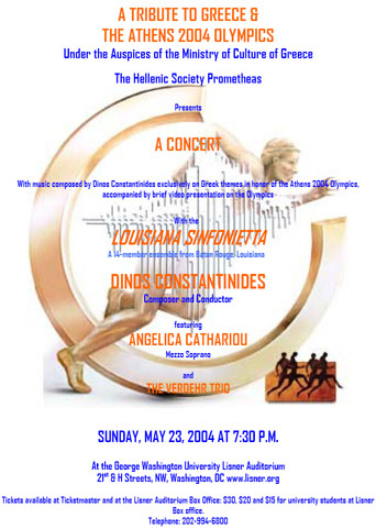 In order to celebrate this historic event, The Hellenic Society Prometheas organizes a concert with selections of classical and contemporary music by renowned composer and Louisiana State University professor Dinos Constantinides. His compositions are inspired by Greek themes, and include a piece dedicated to the 2004 games to be performed for the first time.