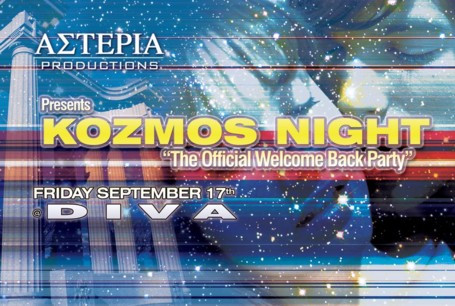 The Olympics & summer nights in A S T E R I A P R O D U C T I O N S Presents: K O Z M O S N I G H T "The Official Welcome Back Party" Welcoming everyone back from one of the most memorable summers in recent times… Also welcoming to The Son’s of Pericles/Maids of Athena… Friday September 17th @ D I V A 1350 I St. NW Featuring: D J Y I A N N I (Kozmos-DC) & D J L I A K O S (Sugar Factory Records) Doors Open: Reduced Admission Before 18 to Club 21 to Drink Proper ID & Dress Required (No exceptions will be made)