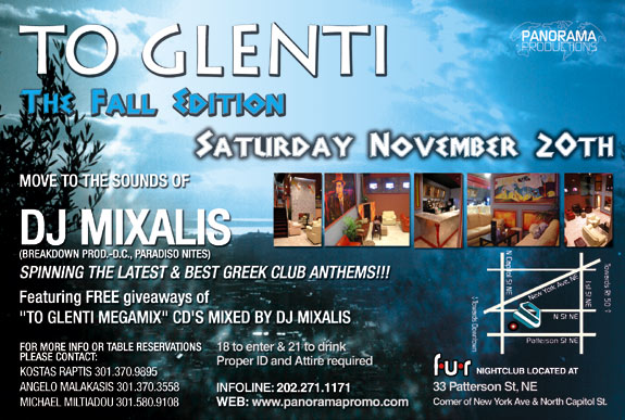PANORAMA PRODUCTIONS PROUDLY PRESENTS “TO GLENTI” (THE FALL EDITION) @ FUR NIGHTCLUB (MAFIA ROOM) (CORNER OF MOVE TO THE SOUNDS OF DC’S HOTTEST GREEK DJ: DJ MIXALIS- (BREAKDOWN PROD.-D.C., PARADISO NITES) SPINNING THE LATEST & BEST GREEK CLUB ANTHEMS & REMIXES ALL NITE FEATURING FREE GIVEAWAYS OF “TO GLENTI MEGAMIX” CD’S MIXED BY DJ MIXALIS 18 TO PARTY, 21 TO DRINK PROPER ID & ATTIRE REQUIRED FOR TABLE RESERVATIONS PLEASE CALL: KOSTAS RAPTIS (301)370-9895 WEB: WWW.PANORAMAPROMO.COM ANGELO MALAKASIS (301)370-3558 MICHAEL MILTIADOU (301)580-9108