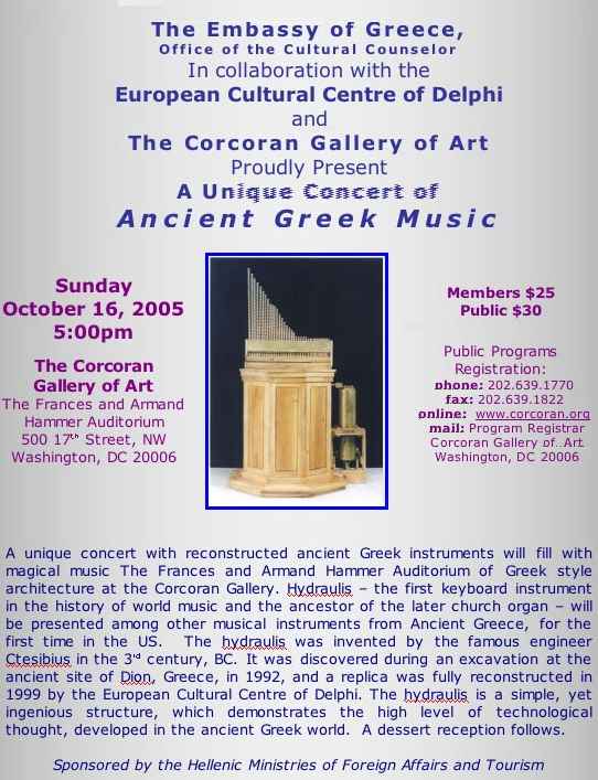 Concert with Ancient Greek Instruments/Dessert Reception In collaboration with the Embassy of Greece The European Cultural Centre of Delphi presents a magnificent concert with hydraulis -- the first keyboard instrument in the history of world museic and the ancestor of the later church organ -- and other musical instruments from ancient Greece. The hydraulis was invented by the famous engineer Ctesibius in the 3rd century, BC, and was discovered during an excavation in 1992, and finally a replica was fully reconstructed in 1999.
