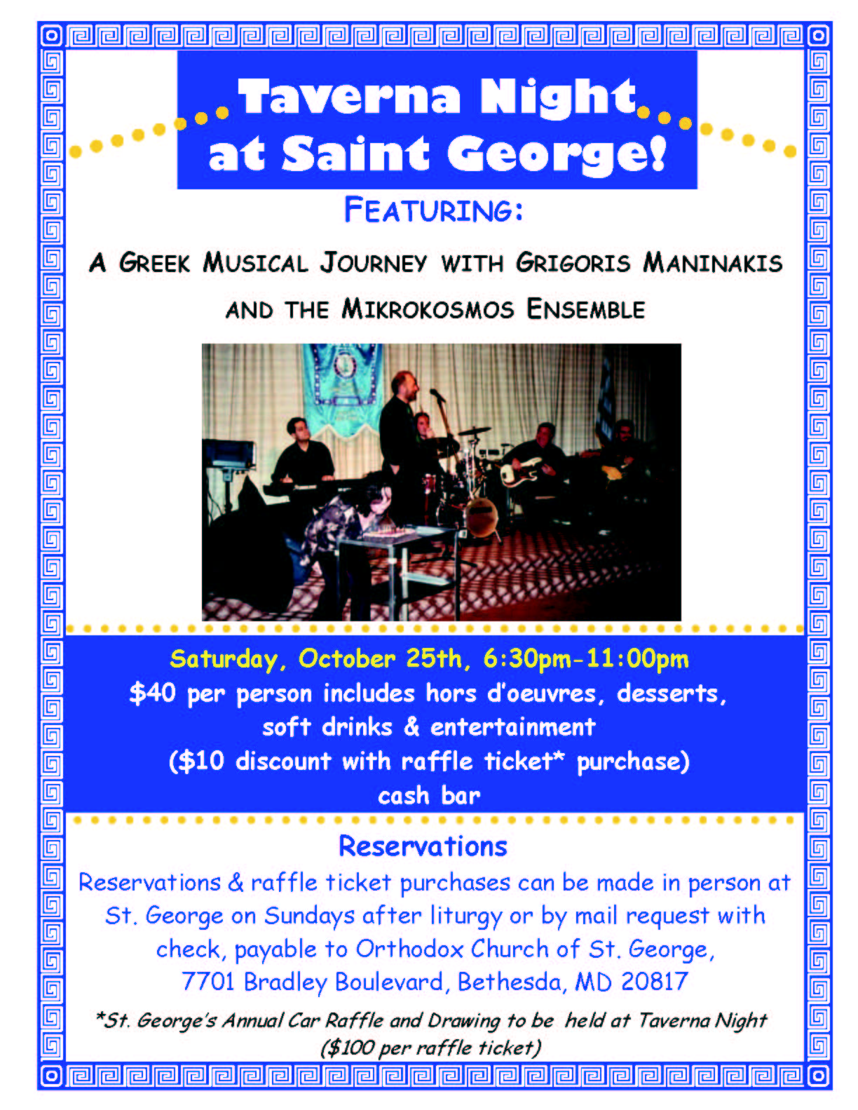 Following the concert portion of the evening, the band will then play Greek dance music for all to enjoy and dance to. Catering for Taverna Night is being provided by CAVA of Rockville, Maryland.