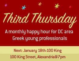 Third Thursday provides young (single and married) Greek-Americans, Greeks, and Cypriots in the DC area a chance to meet in an informal setting. It really is that simple. Whether you are in school or in a job, or somewhere in between, DC native or transplant, you are welcome. You don't even have to live in the area -- If you find yourself often in DC, get on the list. Add yourself to the mix.