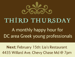 Third Thursday provides young (single and married) Greek-Americans, Greeks, and Cypriots in the DC area a chance to meet in an informal setting. It really is that simple. Whether you are in school or in a job, or somewhere in between, DC native or transplant, you are welcome. You don't even have to live in the area -- If you find yourself often in DC, get on the list. Add yourself to the mix. There is no cover charge and the organizers, Eleni A., George P., and Tia L. do not receive any remuneration for their efforts. Don't Drink and Drive!