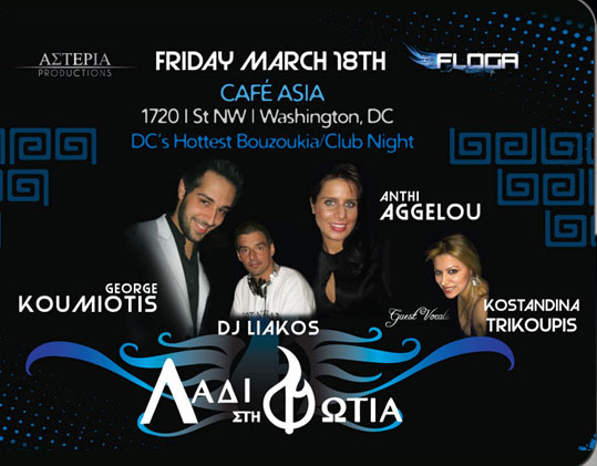 Asteria Productions' Ladi Sti Fotia Featuring DC's own DJ Liakos, live from NYC George Koumiotis, Anthi Aggelou and guest vocals, Konstandina Trikoupis