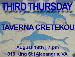 Join us on Thursday, 8/18, at 818 King St in Old Town Alexandria as Third Thursday comes to Taverna Cretekou, a mainstay in the Greek restaurant scene since 1973. While Taverna Cretekou doesn't have a physical bar, what it does have is great food, live bouzoukia, and a picturesque vine-trellised garden patio perfect for lounging on a warm summer's night. We will have a large communal table of 15 reserved inside starting at 7:00 PM, but in order to secure additional prime seating near the band, please RSVP to [email protected] by no later than Wednesday, 8/17/11, at 5:00 PM, so we can make the appropriate arrangements.