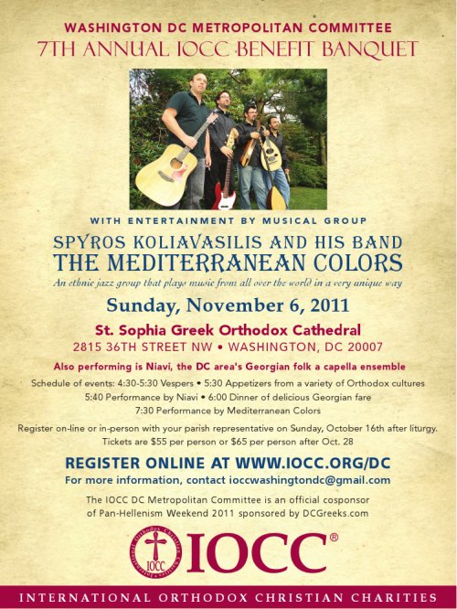 WASHINGTON DC METROPOLITAN COMMITTEE PRESENTS THE 7TH ANNUAL IOCC BENEFIT BANQUET WITH ENTERTAINMENT BY MUSICAL GROUP Spyros Koliavasilis and his band Mediterranean Colors An ethnic jazz group that plays music from all over the world in a very unique way Sunday, November 6, 2011 St. Sophia Greek Orthodox Cathedral 2815 36TH STREET NW • WASHINGTON, DC 20007 Additional performances by Niavi, DC's Georgian folk a capella ensemble and the Lyman Ukranian Dance Ensemble! Schedule of events: • 4:30-5:30 Vespers Tickets are $55 per person or $65 per person after Oct. 28 As a special benefit to all Pan-Hellenism Weekend 2011 attendees, tickets can be purchased to this event for only $50 online via DCGreeks.com's Pan-Hellenism Weekend Registration Form, a $5 discount from the early bird price and a $15 discount from the regular price! Those not taking advantage of the Pan-Hellenism Weekend 2011 Discount can register online at WWW.IOCC.ORG/DC or in person with your parish representative on Sunday, October 16, 2011 after liturgy.For more information, contact [email protected]The IOCC DC Metropolitan Committee is an official cosponsor of Pan-Hellenism Weekend 2011 sponsored by DCGreeks.com