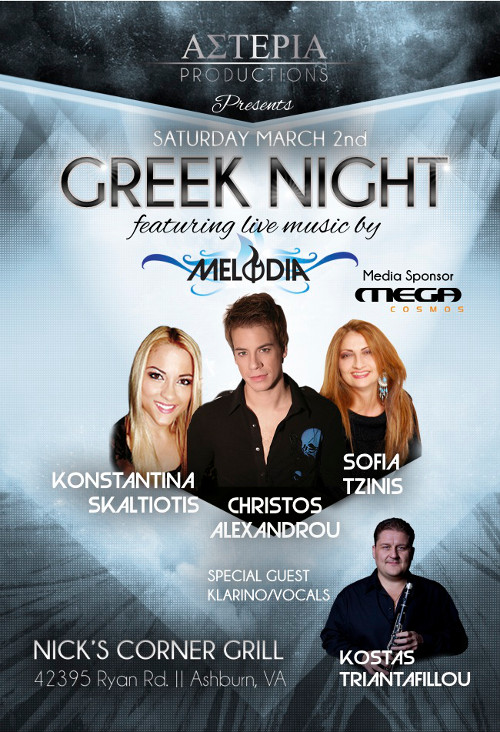 MELODIA: Vocalists Christos Alexandrou | Sofia Tzinis | Konstantina Skalioti Yiani Barlas, Bouzouki, Spiro Vithoulkas, Drums SPECIAL GUEST KLARINO Kostas Triandafillou