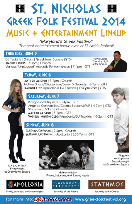 St. Nicholas Greek Folk Festival 2014 June 5-8, 2014 St. Nicholas Church Traditional Greek Food, Drinks & Desserts, Music and Crafts Music & Entertainment Lineup The best entertainment lineup ever at St. Nick's festival! Thursday, June 5 Friday, June 6 Kalomira with Apollonia & DJ George Tsakiris | 10:30pm-2am | GTS Winner of Fame Story 2 and Gold Record artist Kalomira