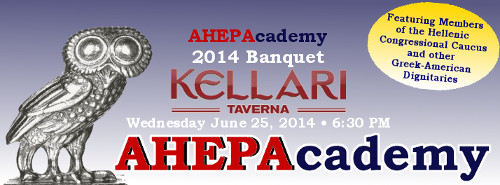 You are cordially invited to join AHEPAcademy’s Class of 2014 for its: AHEPAcademy 2014 Banquet at Kellari Taverna 1700 K Street NW Wednesday, June 25, 2014 Business Attire Featuring Members of the Hellenic Congressional Caucus Come join current AHEPAcademy students, alumni, instructors, friends and supporters for a fantastic four-course meal featuring Kellari’s famed Greek-inspired meat and seafood entrees and wine and beer selections. This annual event brings together Greek American leaders and professionals from Washington, DC and beyond to network with and celebrate our community’s future young leaders. Suggested Donation: $65 - $100+ made payable to AHEPAcademy, Inc. (A $65 Donation covers the cost of the meal including wine, beer, tax and gratuity; any additional contributions go to defray cost of attendance of AHEPAcademy students, alumni, instructors, and dignitaries.) *Please RSVP by Monday, June 23, 2014 at 5:00 PM Guests are encouraged to purchase their tickets securely online through [email protected]. AHEPAcademy is a leadership and professional development program organized under the Order of AHEPA that identifies, educates, inspires, mentors, advances, and networks exceptional Greek-American high school students as they progress through their high school, college, graduate and professional careers. It features a summer program held on the campus of George Mason University that unites exceptional Greek-American students from all over the country for a week of interactive learning featuring team building and networking exercises, professional development seminars, briefings by the Greek and Cypriot Ambassadors, visits with prominent Greek-American members of Congress, and visits to Washington, DC area monuments, museums, and cultural attractions. The goal of the program is to produce tomorrow’s young leaders of the Greek American community who will not only feel accountable to the Greek American community, but will rise to positions in American society to assist not only each other, but Greek-America as a whole.