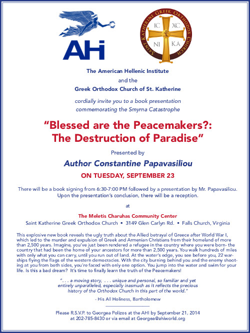 The American Hellenic Institute and the Greek Orthodox Church of St. Katherine cordially invite you to a book presentation commemorating the Smyrna Catastrophe “Blessed are the Peacemakers?: The Destruction of Paradise” Presented by Author Constantine Papavasiliou ON TUESDAY, SEPTEMBER 23, 2014 There will be a book signing from 6:30-7:00 PM followed by a presentation by Mr. Papavasiliou. Upon the presentation’s conclusion, there will be a reception. at The Meletis Charuhas Community Center Saint Katherine Greek Orthodox Church • 3149 Glen Carlyn Rd. • Falls Church, Virginia This explosive new book reveals the ugly truth about the Allied betrayal of Greece after World War I, which led to the murder and expulsion of Greek and Armenian Christians from their homeland of more than 2,500 years. Imagine, you’ve just been rendered a refugee in the country where you were born- the country that had been the home of your ancestors for more than 2,500 years. You walk hundreds of miles with only what you can carry, until you run out of land. At the water’s edge, you see before you, 22 warships flying the flags of the western democracies. With the city burning behind you and the enemy shooting at you from both sides, you’re faced with only one option. You jump into the water and swim for your life. Is this a bad dream? It’s time to finally learn the truth of the Peacemakers! “. . . a moving story, . . . unique and personal, so familiar and yet entirely unparalleled, especially inasmuch as it reflects the precious history of the Orthodox Church in this part of the world.” - His All Holiness, Bartholomew Please R.S.V.P. to Georgea Polizos at the AHI by September 21, 2014 at 202-785-8430 or via email at [email protected]. |