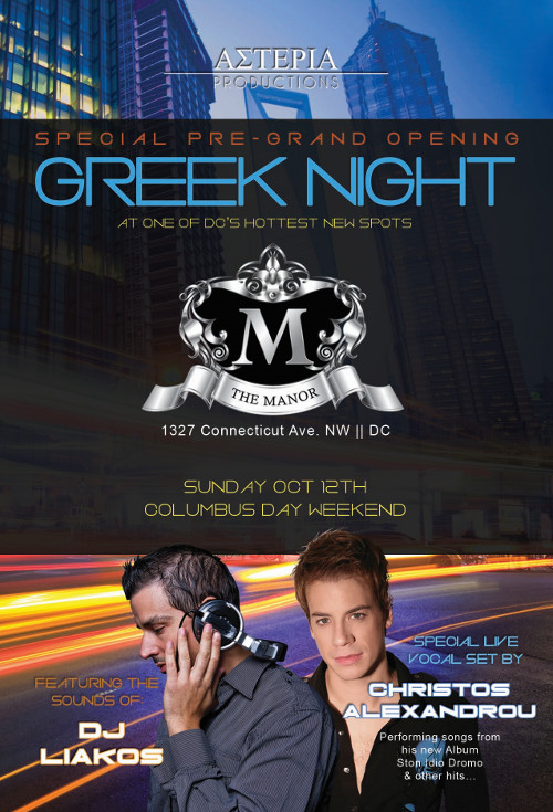 The Manor Featuring the sounds of DC's own DJ Liakos back in the city, spinning the latest and best in Greek together with a very special live vocal set by recording artist Christos Alexandrou, who will be performing hits from his new Greek album Ston Idio Dromo, along with other popular tracks.