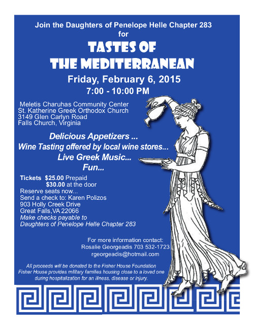 Join the Daughters of Penelope Helle Chapter 283 Friday, February 6, 2015 Meletis Charuhas Community Center Delicious Appetizers Tickets Reserve seats now... Send checks to: Make checks payable to: Daughters of Penelope Helle Chapter 283 All proceeds will be donated to the Fisher House Foundation. Fisher House provides military families housing close to a loved one during hospitalization for an illness, disease or injury.