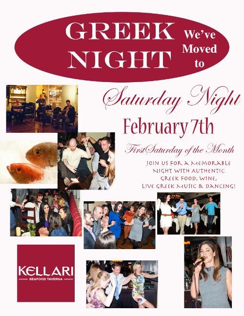 Join us on Saturday, February 7, 2015 for a memorable night with authentic Greek food, wine, live Greek music and dancing at the debut of Kellari's First Saturday of the Month Greek Night on its new regular night!