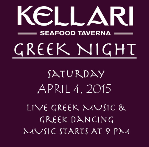 Saturday, April 4, 2015 Join us on Saturday, April 4, 2015 for a memorable night with authentic Greek food, wine, live Greek music and dancing at Kellari's First Saturday of the Month Greek Night! Choose from our full menu of authentic Greek dishes and our Wine Spectator award-winning Greek and imported wine list while you enjoy traditional Greek music starting at 9:00 PM. Dinner reservations are encouraged or come for drinks at the bar with scores of Greek young professionals.