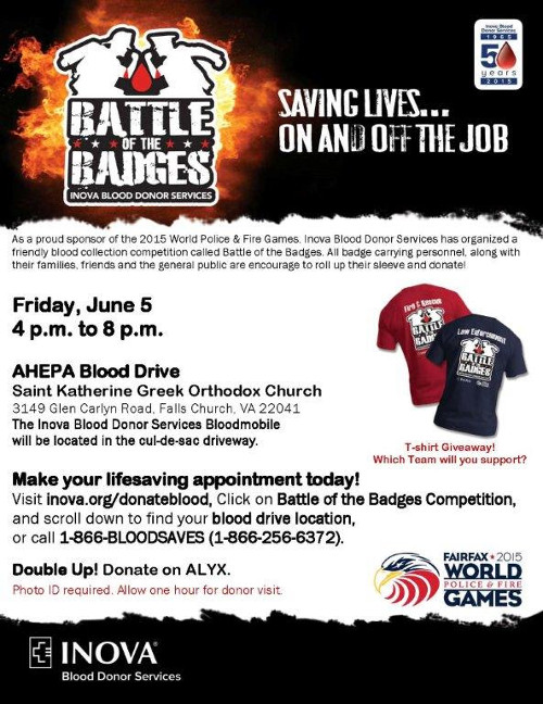As a proud sponsor of the 2015 World Police & Fire Games, Inova Blood Donor Services has organized a friendly blood collection competition called Battle of the Badges. All badge carrying personnel, along with their families, friends and the general public are encourage to roll up their sleeve and donate! AHEPA Blood Drive St. Katherine Greek Orthodox Church The Inova Blood Donor Services Bloodmobile will be located in the cul-de-sac driveway. Visit http://inova.org/donateblood, Click on Battle of the Badges Competition, and scroll down to find your blood drive location or call 1-866-BLOODSAVES (1-866-256-6372) Double Up! Donate on ALYX. Photo ID required. Allow one hour for donor visit. COME and ENJOY the St. Katherine's Greek Festival and donate. SEE YOU THERE!! |