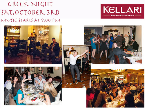Saturday, October 3, 2015 Join us on Saturday, October 3, 2015 for a memorable night with authentic Greek food, wine, live Greek music and dancing at Kellari's First Saturday of the Month Greek Night! Choose from a full menu of authentic Greek dishes and Wine Spectator award-winning Greek and imported wine list while you enjoy traditional Greek music starting at 9:00 PM. Dinner reservations are encouraged or come for drinks at the bar with scores of Greek young professionals.
