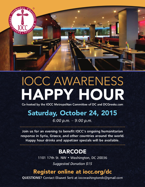 Cohosted by the IOCC Metropolitan Committee of DC & DCGreeks.com Saturday, October 24, 2015 6:00 p.m. - 9:00 p.m. Join us for an evening to benefit IOCC's ongoing humanitarian response in Syria, Greece, and other countries around the world. Happy hour drinks and appetizer specials will be available.