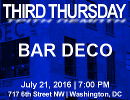 Join us on Thursday, July 21, 2016 at 7:00 PM as Third Thursday visits Bar Deco in Chinatown.  Inspired by the art deco period and America’s industrial roots, newly opened Bar Deco takes simple food and drink to the next level by mixing traditional preparation with globally-inspired flavors.  Find us on the rooftop patio if the weather is nice.