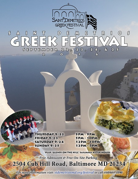 Saint Demetrios Greek Orthodox Church of Baltimore, MD presents their 43rd Annual Greek Festival from September 22 through September 25, 2016. Come join us in a celebration of life, music, delicious food, faith and friendship when the magic of Greece comes to town.