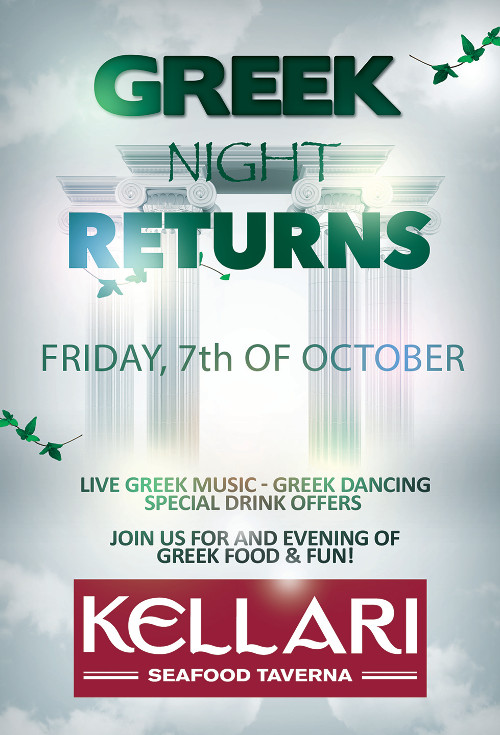 wine, live Greek music and dancing at Kellari's Monthly Greek Night returns from its summer hiatus!