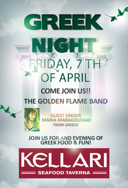 Join us on Friday, April 7, 2017 for a memorable night with authentic Greek food, wine, live Greek music and dancing as Kellari's Monthly Greek Night welcomes the Golden Flame Band with Special Guest Direct from Greece, Maria Maragoudaki!