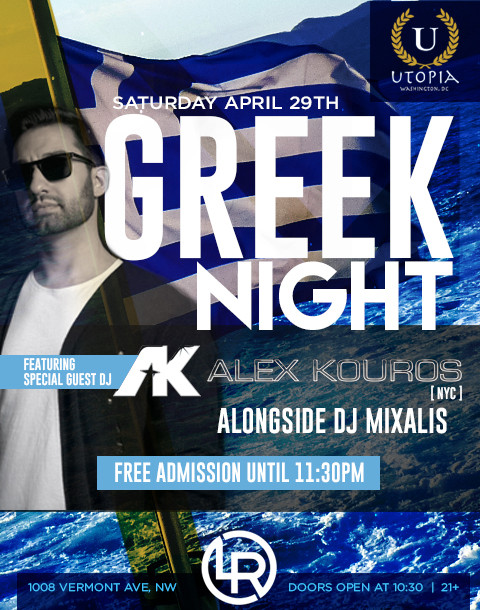 Utopia Presents Greek Night at Living Room Saturday, April 29, 2017 Music by Special Guest from NYC DJ Alex Kouros Along with Utopia Resident DJ Mixalis Doors Open at 11:00 PM | Free Admission Before 11:30 PM