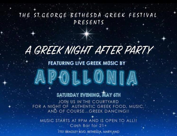 Saint George Bethesda Greek Festival Presents A Greek Night After Party Featuring Live Greek Music by APOLLONIA Saturday Night, May 6, 2017 Join us in the courtyard for a night of authentic Greek food, music, and of course... Greek dancing!! Music starts at 9 PM and is open to all!! Cash Bar for 21+