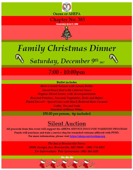 PLEASE JOIN US FOR OUR ANNUAL CHRISTMAS CELEBRATION! ALL PROCEEDS FROM THE SILENT AUCTION WILL GO TOWARD AHEPA'S CANININES FOR WARRIORS PROGRAM - TO PURCHASE SERVICE DOGS FOR VETERANS AFFLICTED BY PTSD.