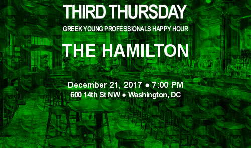 Third Thursday Greek Young Professionals Happy Hour Join us on Thursday, December 21, 2017 at 7:00 PM as the Third Thursday Greek Young Professionals Happy Hour series closes out 2017 at The Hamilton in Washington, DC. The Hamilton's revolutionary cocktail list features small-crafted American spirits. Many of these recipes predate Prohibition, exemplifying the amazing diversity of distilled spirits that America was known for and is now spearheading the cocktail revolution.