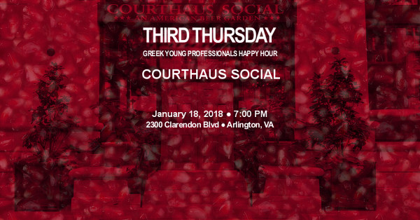 Third Thursday Greek Young Professionals Happy Hour Join us on Thursday, January 18, 2018 at 7:00 PM as the Third Thursday Greek Young Professionals Happy Hour series opens up 2018 at Courthaus Social in the Court House neighborhood of Arlington, VA. Given the large number of recent transplants to the Greek community settling in the famed Ballston-Rosslyn corridor of Arlington, we anticipate this being one of the better-attended Third Thursdays we've hosted in Virginia in quite a while. We've reserved several booths in the bar area and are working on getting extended happy hour food and drink specials for the group.