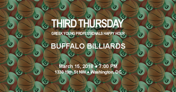 Join us on Thursday, March 15, 2018 at 7:00 PM as the Third Thursday Greek Young Professionals Happy Hour series takes in the first full day of NCAA Division I Men's Basketball Tournament action at Buffalo Billiards in the Dupont Circle neighborhood of Washington, DC.  With 18,000 square feet of space, Buffalo Billiards features four 10' projection screens and 40 smaller screens to take in all the night's action.  Even if your team's not is in the tourney or your bracket's already busted, you can still have fun with your fellow Greeks and Philhellenes as Buffalo Billiards sports 18 pool tables, skeeball, shuffeboard and more!