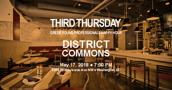 Join us on Thursday, May 17, 2018 at 7:00 PM as the Third Thursday Greek Young Professionals Happy Hour series visits District Commons in the Foggy Bottom neighborhood of Washington, DC!  District Commons epitomizes cool comfort on Washington Circle and is a 21st century take on the traditional American tavern. This space stands the traditional dark wood tavern on it's head, updating it with dynamic and stylish verve!